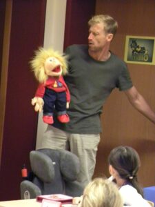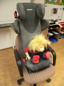 Ein geschulter KFV-Mitarbeiter kam in die Klasse und bearbeitete das Thema Kindersitz mit einer Handpuppe gemeinsam mit den Kindern.