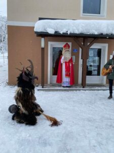 Am 6. Dezember verspürte man die Aufregung und Nervosität in der Volksschule Untertauern. Niemand wusste es so genau. Kommen Nikolaus und Krampus heuer oder nicht? Nach der großen Pause gingen alle Schülerinnen und Schüler vor die Schule und sangen ein paar Nikolauslieder. Nach ein paar gesungenen Liedern hörte man plötzlich eine Glocke. War das eine Überraschung! Mit einem Lied wurden Nikolaus und sein Begleiter vor der Schule empfangen. Danach las der Nikolaus im Freien für jede Schulstufe aus seinem goldenen Buch vor. Nach seinen lobenden Worten bekamen die Kinder ein Nikolaussackerl. Bevor der Nikolaus mit seinem Krampus weiterzog, wurden Lieder gesungen und Gedichte vorgetragen.