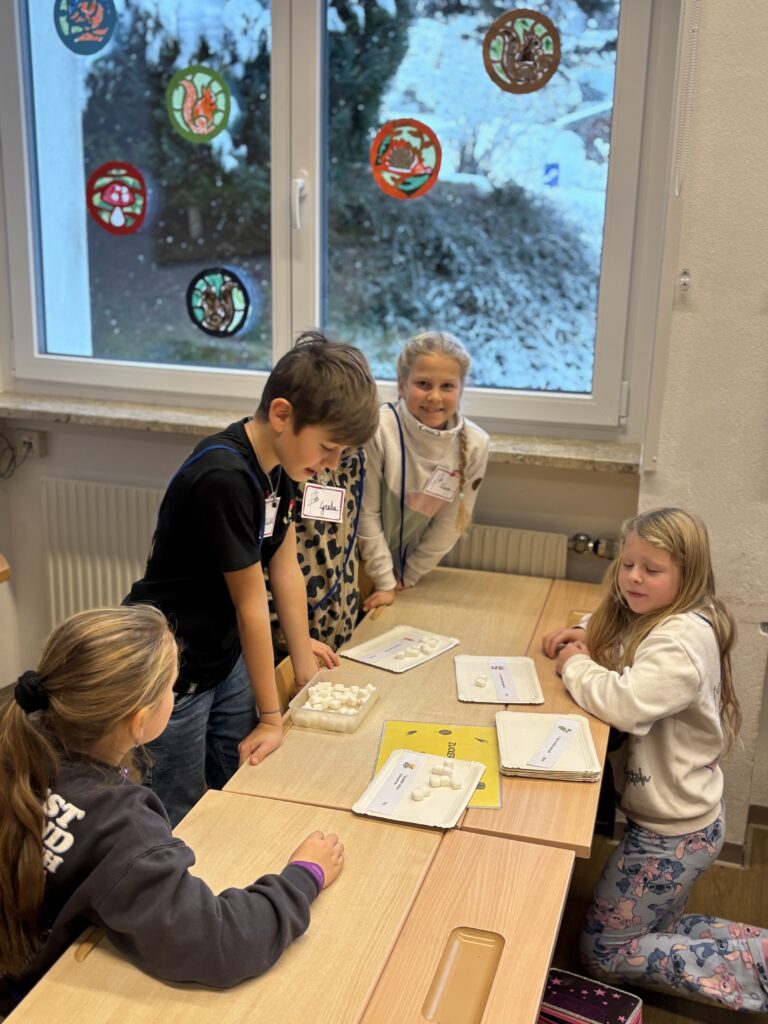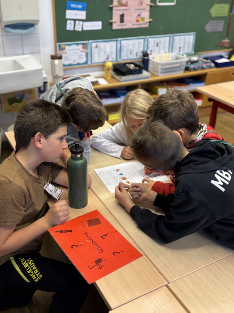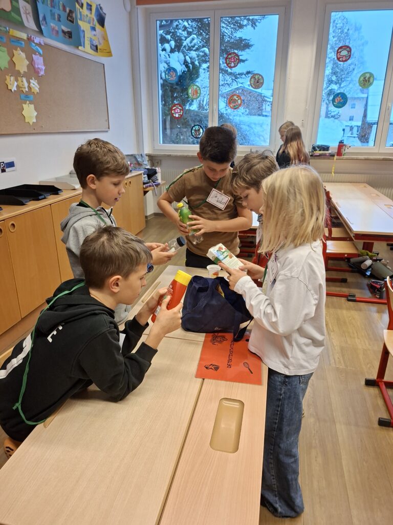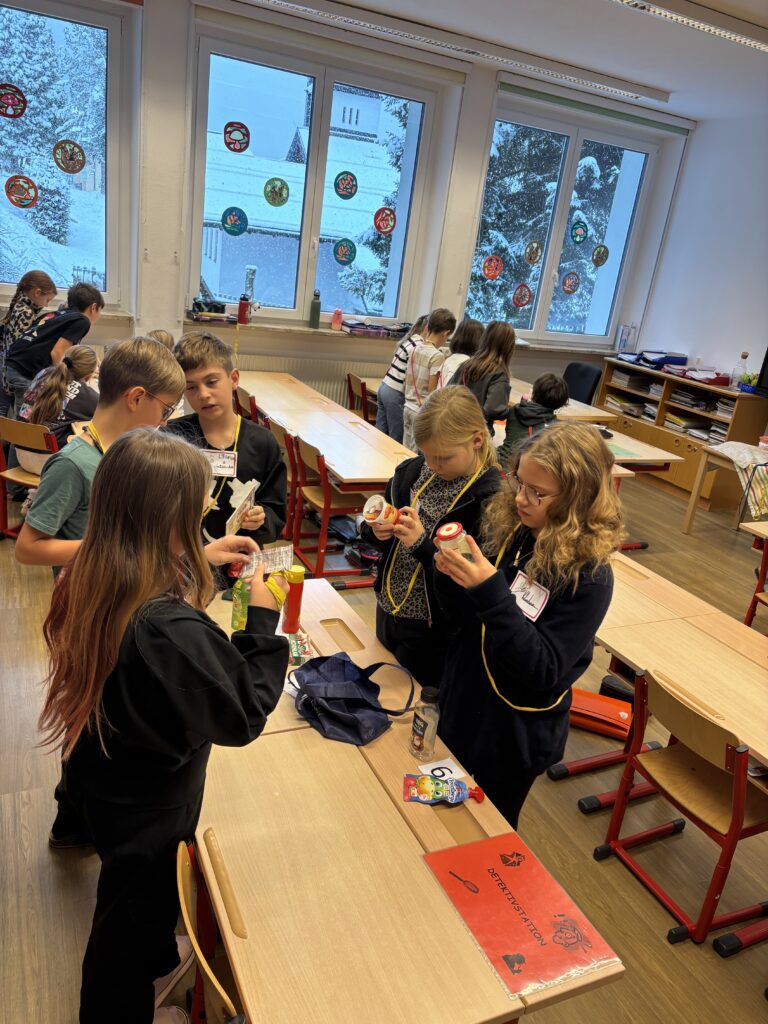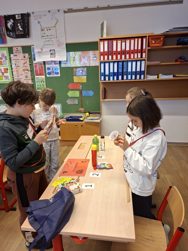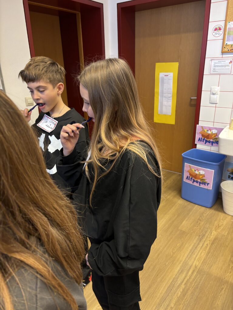 In der Klasse 2 standen der Zuckergehalt in Lebensmitteln, das Lesen von Verpackungsangaben sowie der Vergleich verschiedener Getränke im Mittelpunkt. Die Kinder erkannten, was gesunde Lebensmittel ausmacht, und konnten ihre praktische Zahnpflege weiter festigen.